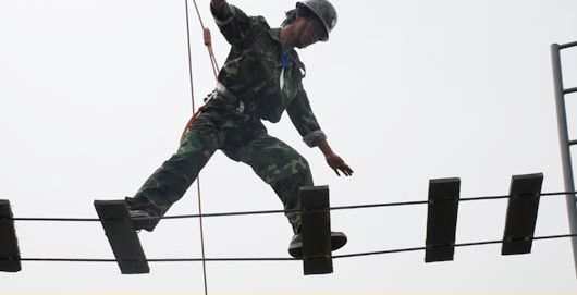 2、學員身穿安全帶,頭戴頭盔,獨自爬上八米左右的緬甸橋,沿著橋上的竹竿向?qū)Π蹲?,在這個過程中,不斷越過沒有竹竿的空白區(qū)域,同時要盡量保持身體平衡,如果是比賽,兩隊可以在規(guī)定時間內(nèi)通過的人數(shù)為衡量標準。