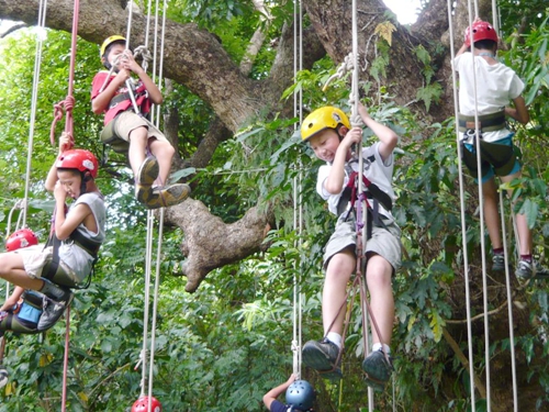 每棵樹安排3-5名小朋友進行體驗。在教練和家長的指導(dǎo)下,開始練習各種攀爬動作。系上安全帶,戴上安全頭盔,一只腳踩著輔繩,站起、坐下,人即從地面上升半米。如此反復(fù),幾分鐘之后,就到達樹梢。孩子的家長在下面協(xié)助保護孩子安全;